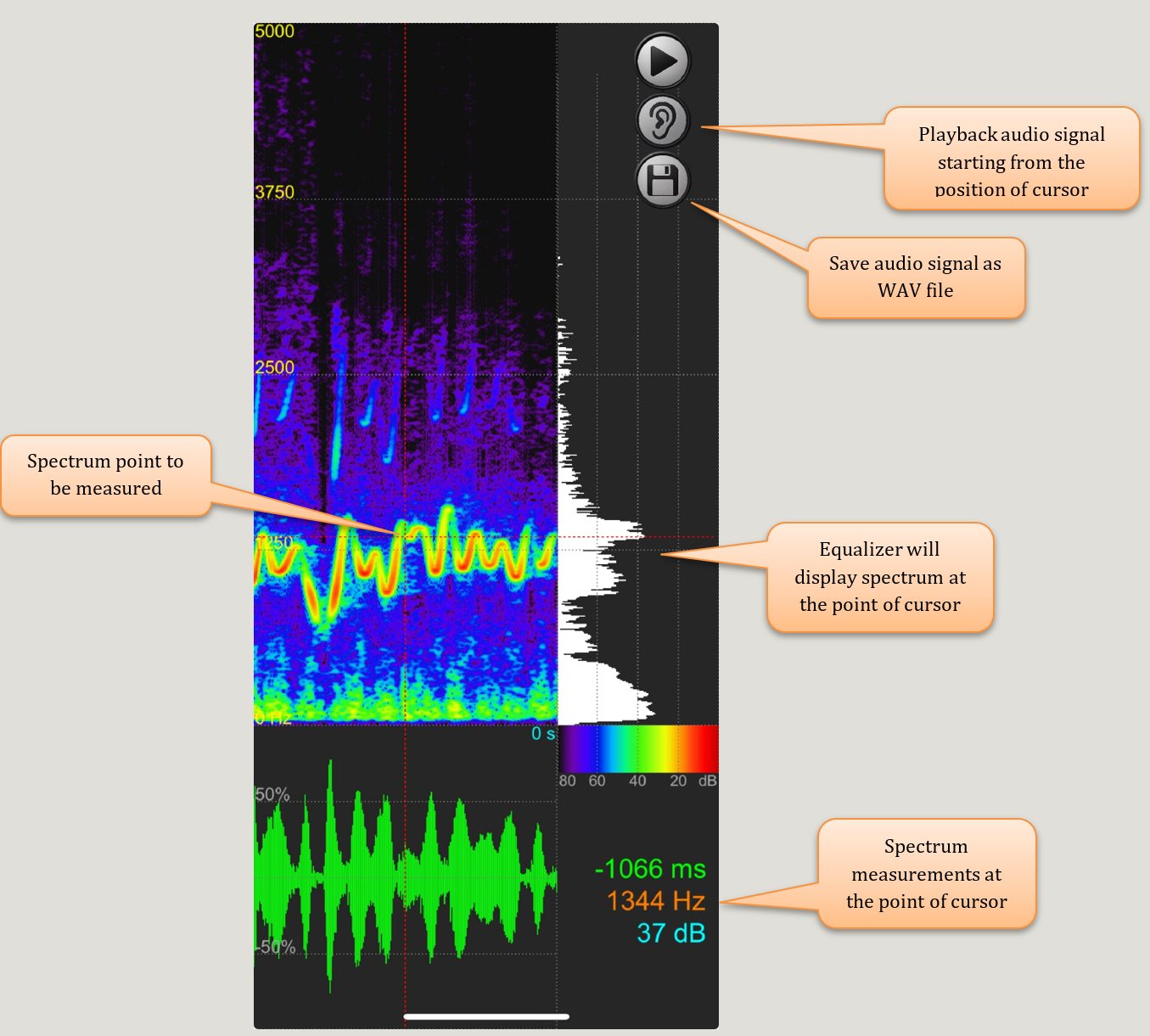At any time while in Spectrum Measurement Mode, you can play back a portion of the audio signal starting from the position of the movable cursor and continuing to the end of the recording by tapping the ear icon button.